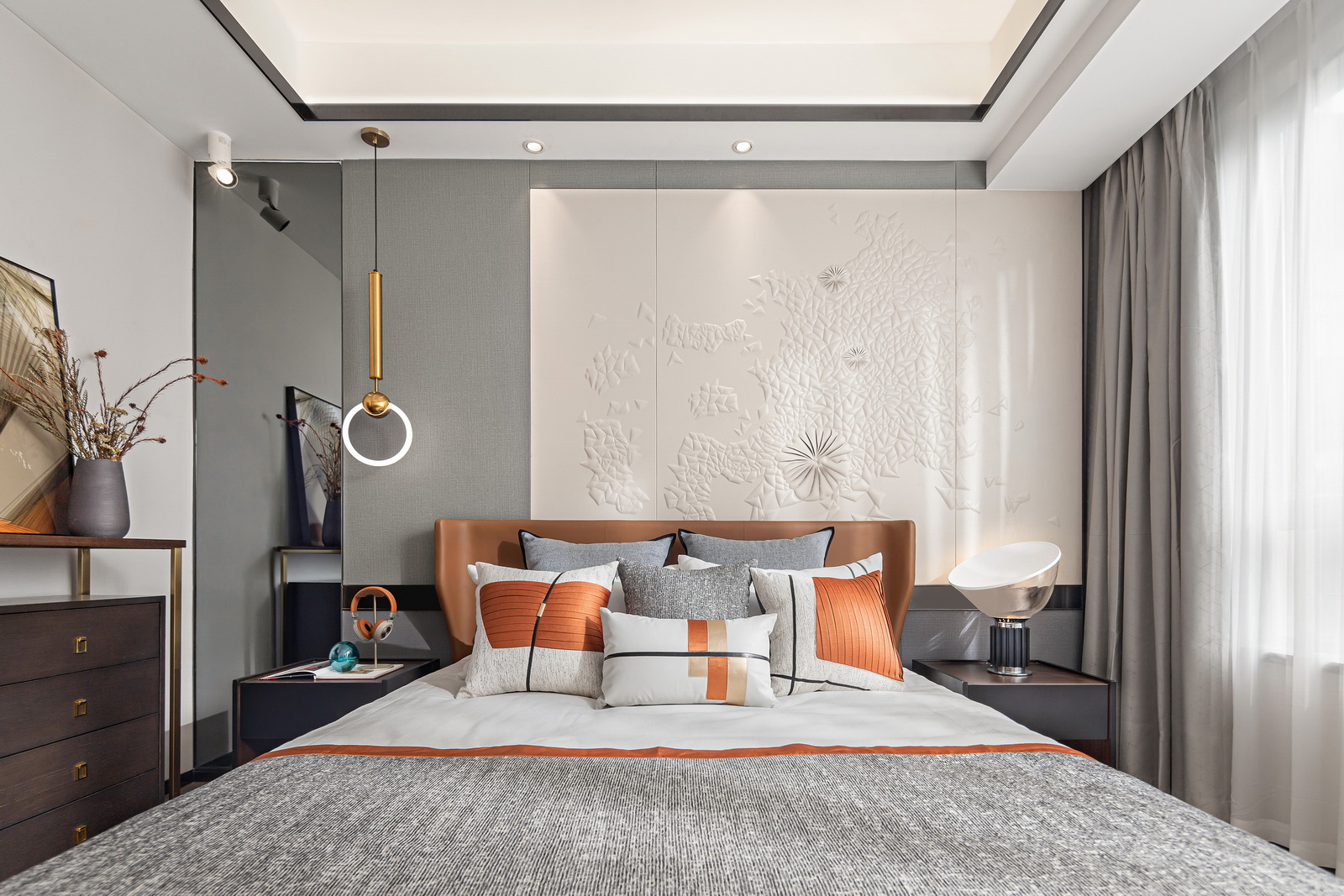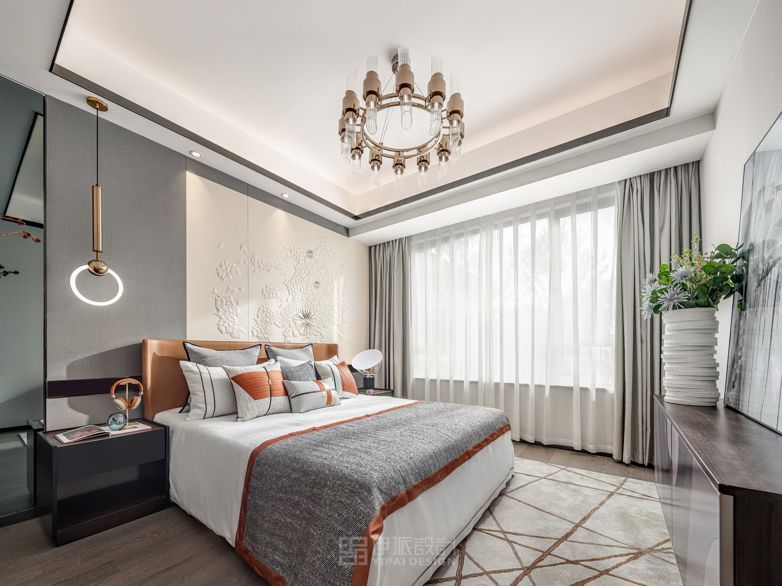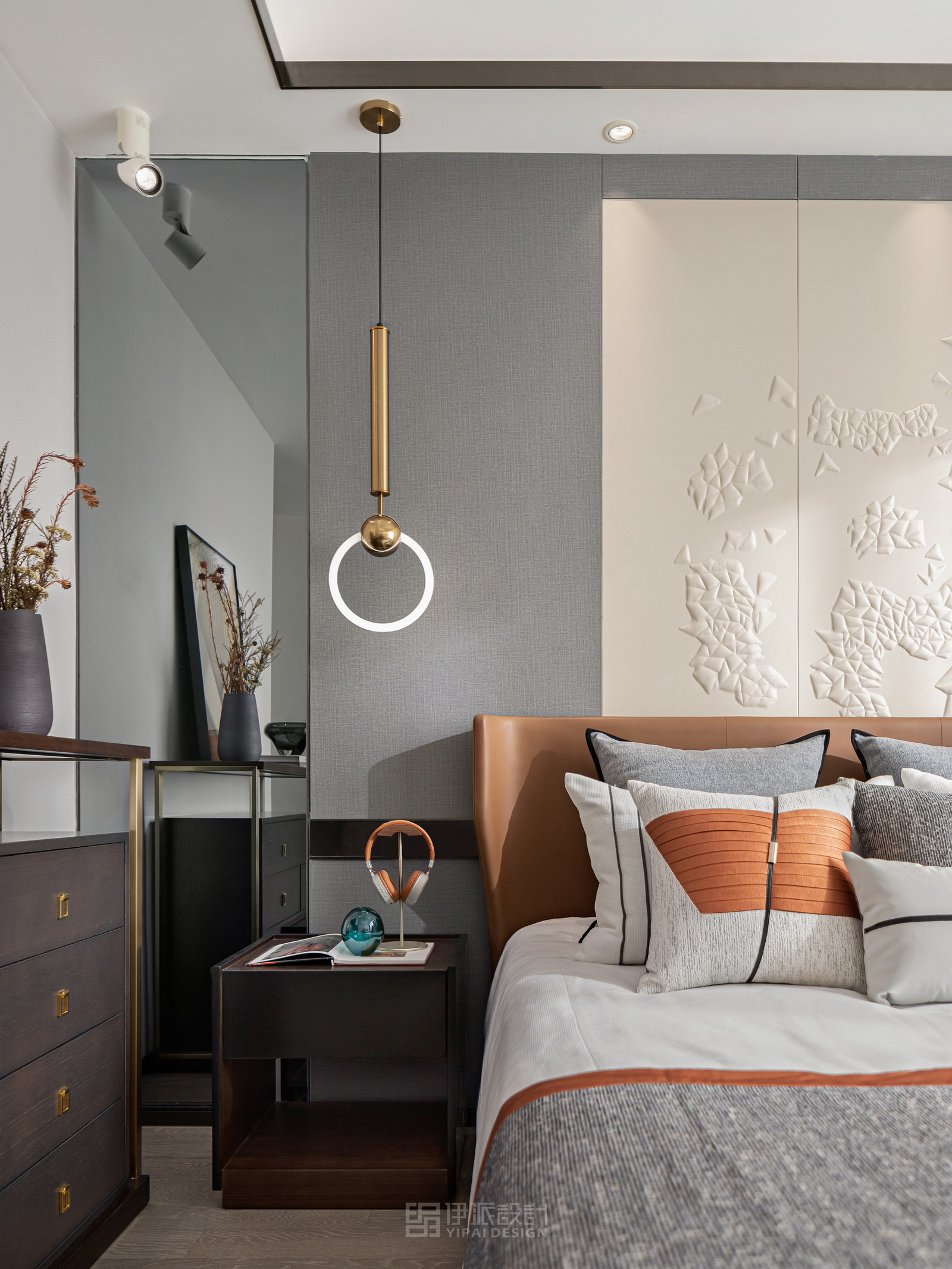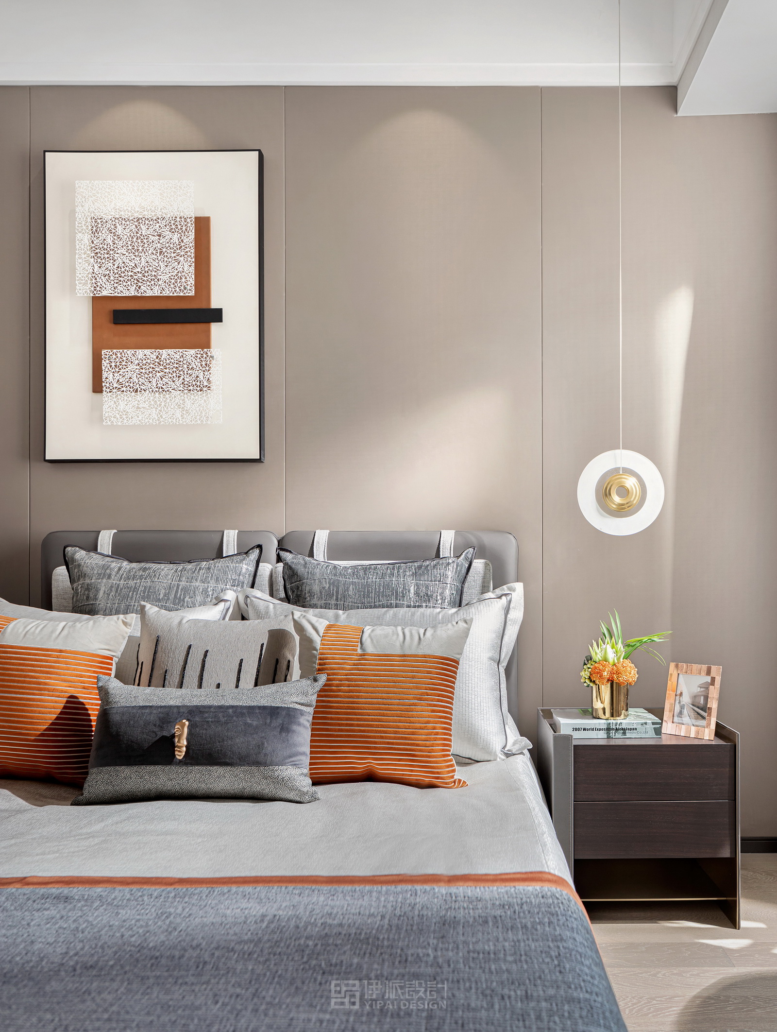 本案風(fēng)格為現(xiàn)代港式風(fēng)格,采用時(shí)尚精簡(jiǎn)、低調(diào)內(nèi)斂的高級(jí)灰是用于家居裝扮的首選基調(diào)色彩,呈現(xiàn)優(yōu)雅魅力和精致大氣的視覺感官,符合人們對(duì)現(xiàn)代生活的審美需求。同理,作為潮流都市代表色之一的暖橙,伊派設(shè)計(jì)在居家設(shè)計(jì)中的運(yùn)用中,讓空間張揚(yáng)不浮夸、經(jīng)典且時(shí)尚,成為永恒不變的奢侈品味。